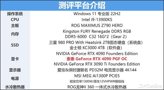 索泰RTX 4090 PGF OC的里里外外大家都见证过了,下面就该真刀真枪的上机测试了。还是编辑部的天花板配置,CPU用的是最新的Intel Core i9-13900KS,华硕的Z790 Hero主板搭配2根16GB的金士顿DDR5-6000高频内存。