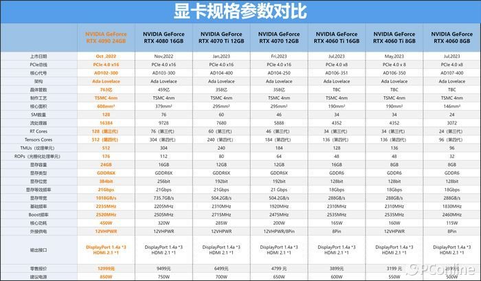 大家带着几个关键字来看上面的【显卡规格参数对比】表格,就可以更容易读懂上述表格了。最新一代的桌面显卡GeForce RTX 40系列均采用全新的Ada Lovelace架构核心, GeForce RTX 4090的核心是 AD102,目前Ada Lovelace架构核心中最为强大的,具有760亿个晶体管、16384个CUDA核心和24 GB高速美光GDDR6X显存。