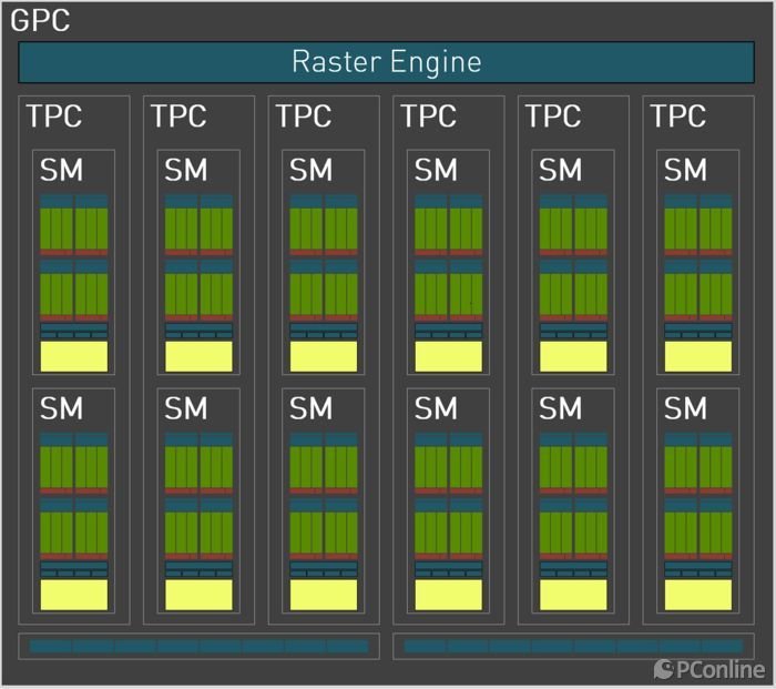 刚才我们已经说到,一个完整的Ada Lovelace架构AD102核心内部拥有12个GPC,而每个完整的GPC中包含了一个专用的Raster Engine(光栅化引擎),两组ROPs共16个ROP(光栅化处理单元),以及6个TPC与12个SM单元。