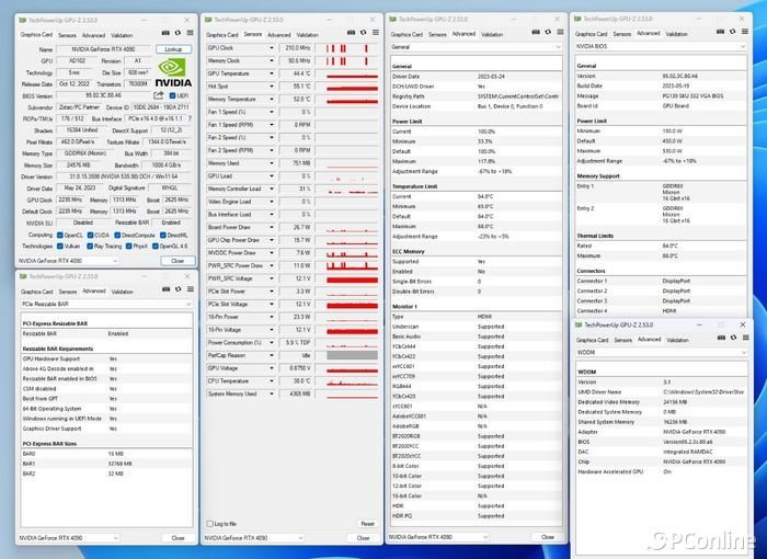 再看看它的功耗与温度墙限定,不得不说高端显卡就是非同凡响,索泰RTX 4090 PGF OC的默认TGP设定为450W,不过这是普通的RTX 4090的极限,不是索泰RTX 4090 PGF OC的极限,它支持解锁功耗,最大TGP可至530W,温度墙也是给到了88℃,看来超频测试是少不了了。