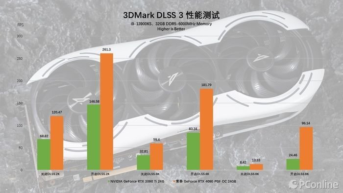 不过要说提升最大的就得属光追与老黄引以为傲的DLSS了,在Port Royal测试中,索泰RTX 4090 PGF OC领先RTX 3090 Ti就有23%以上!而在DLSS方面,这张显卡的提升堪称恐怖,2K下开关DLSS可以有超百帧的差距,更离谱的是8K下,仅开启DLSS 2也能做到60 FPS流畅运行。