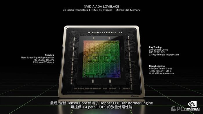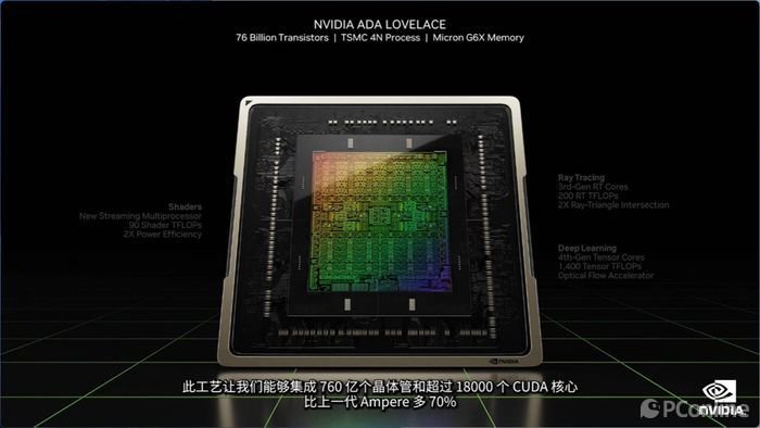 在讲述核心架构前,我们先了解几个关键词:GeForce RTX 4090、Ada Lovelace、TSMC 4N、608mm²、760亿个晶体管、2倍性能功耗比。