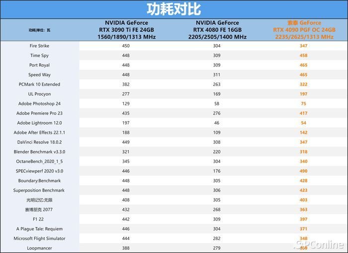 就看这个表现,你就说索泰RTX 4090 PGF OC牛不牛吧!用更低的功耗实现更强的性能,完全吊打上代卡皇,这才是顶级RTX 4090应有的表现。老黄的Ada Lovelace架构配合TSMC的4N工艺,40系的功耗比堪称逆天!