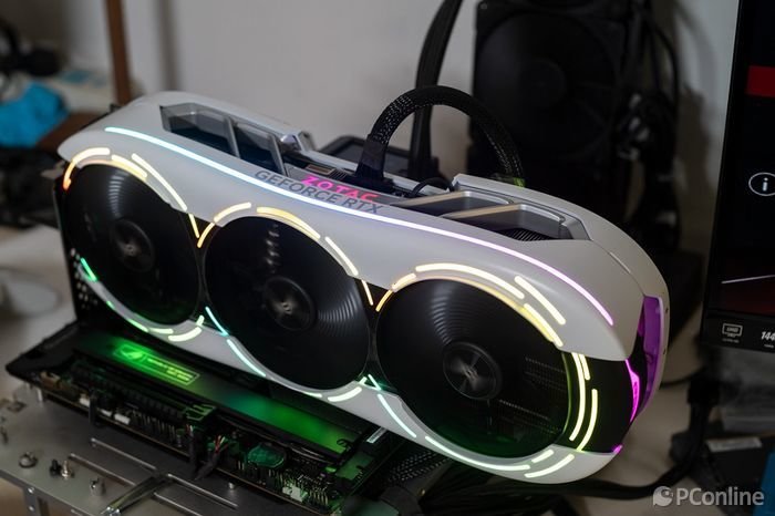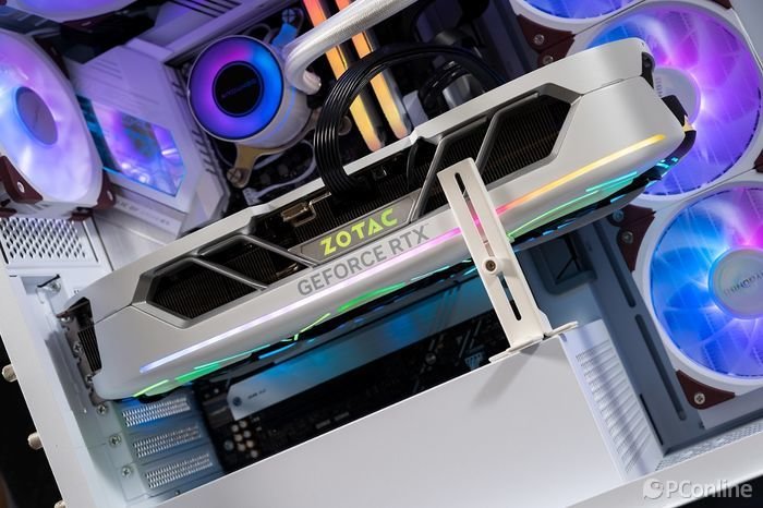 显卡通电后,顶部的索泰ZOTAC信仰Logo灯率先亮起,多彩的变化加上醒目的设计,辨识度算是拉满了。