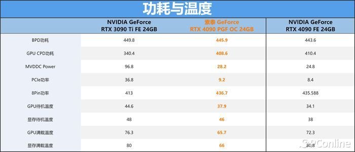 众所周知,这是一张功耗可以干到530W的旗舰显卡,那实际使用中,会不会功耗爆炸?这里我们还利用HWINFO64软件与FrameView软件双重记录多款显卡的功耗表现情况,从图中可以看到索泰RTX 4090 PGF OC的功耗控制相当出色,测试的多款软件与游戏中,功耗都维持在400W附近,功耗表现远低于上代的RTX 3090 Ti。