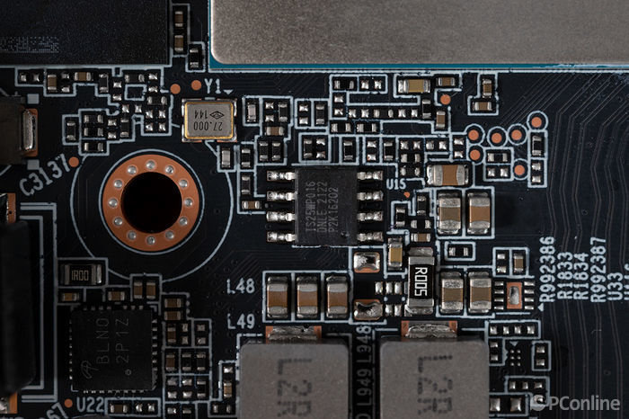 当然,上面提及芯片,PCB上还有众多不可或缺的芯片,例如在核心周围还能看到两颗BIOS控制芯片,型号为IS25WP016,分别控制这款显卡的默认BIOS与极速BIOS。