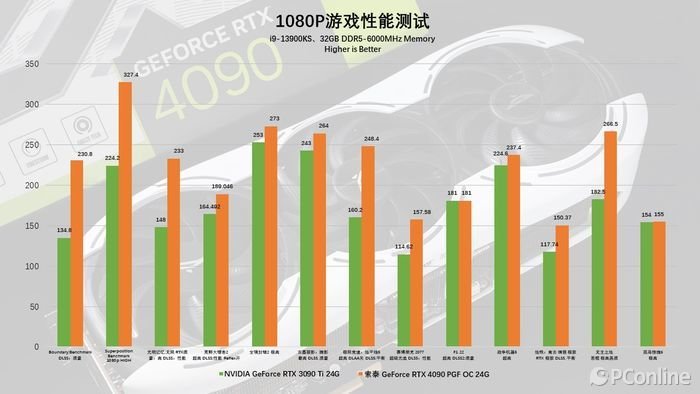 再来就是玩家最期待的游戏性能测试了,想必买这张卡的玩家应该都不缺4K显示器吧,这里我们就着重说说它的4K以及8K表现了。不过还是给大家看看它在1080P跟2K的表现,索泰RTX 4090 PGF OC就是乱杀,大部分游戏都在200 FPS以上,这已经不是入门电竞的水平了,而是专业电竞的表现。