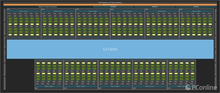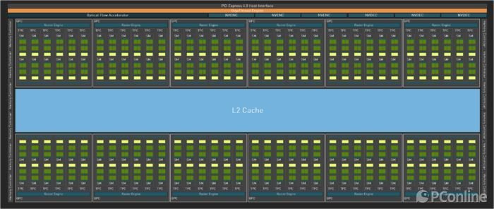 另外缓存方面Ada Lovelace架构也进行了大规格的提升,首先每个SM单元中单独配上了128 KB的缓存,这样RTX 4090显卡中就实现了163MB L1/共享内存。其次核心的二级缓存进行进行了重新的设计,并且完整AD102核心是96MB二级缓存,而RTX 4090显卡拥有72MB二级缓存,也可能是因此Ada Lovelace架构核心对显存位宽的依赖性并不高。