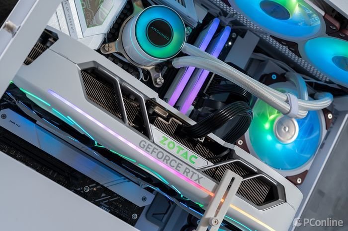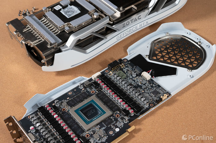 索泰可不光在正面安排了RGB,在背部也藏了RGB设计,独有的PGF Logo信仰灯与顶部的ZOTAC Logo信仰灯相互呼应,共同点缀着这张高贵的卡皇。