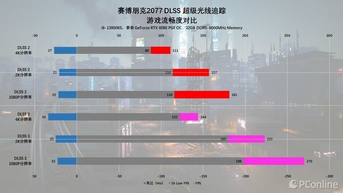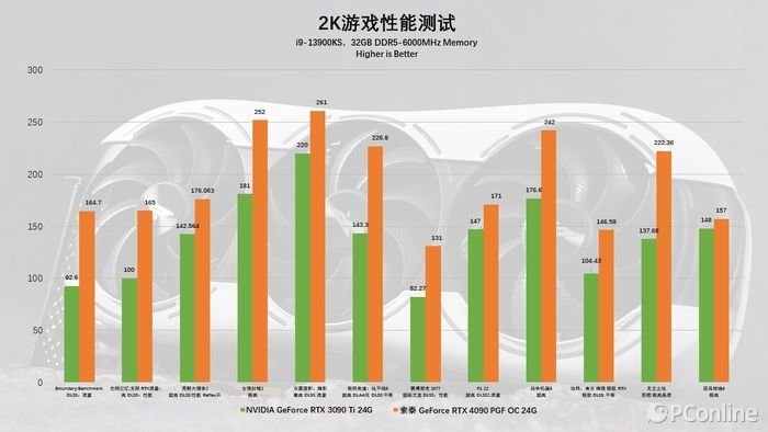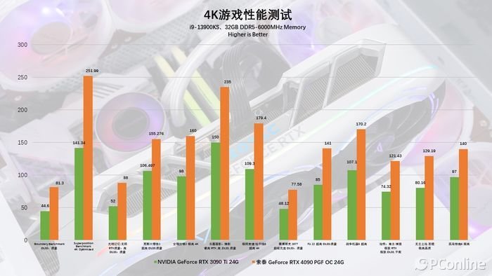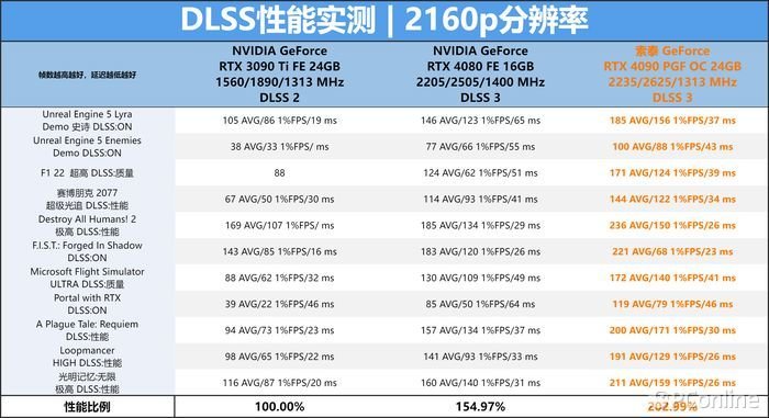 首先是2K分辨率下,开启DLSS 2的索泰RTX 4090 PGF OC相比起前代卡皇已经大幅领先了,一旦开启了DLSS 3,这张显卡仿佛脱缰的野马!2K下不少游戏有了300+的帧数表现,看来还是太小看这张索泰RTX 4090 PGF OC了,4K甚至8K才是它的战场。