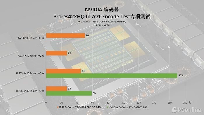先看看大家关心的速度,我们选用NVIDIA提供的样片进行导出测试,有第八代NVENC双编码器加持的索泰RTX 4090 PGF OC确实能带来更好的性能表现,同样是H.265视频输出,它的效率就要比上代显卡快多了;若你是输出8K30的视频,这张天花板级别的RTX 4090只需要46秒就能完成了,相比之下隔壁的RTX 3090 Ti却要170秒,几乎是4倍的效率提升!