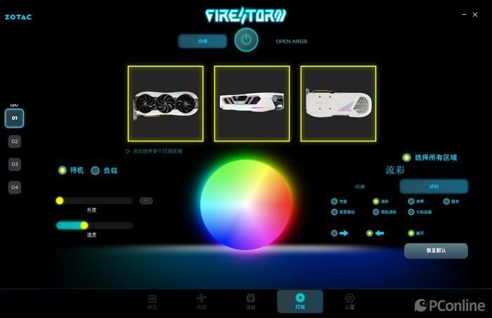 玩灯那总要可以自定义吧,索泰的FireStorm软件就集成了这个功能,玩家可以用它自定义RGB,在电源接口的旁边还有OPEN ARGB接口,通过附赠的线即可实现整机灯效同步,实现千变万化的灯效设计,打造专属于你的靓丽显卡。