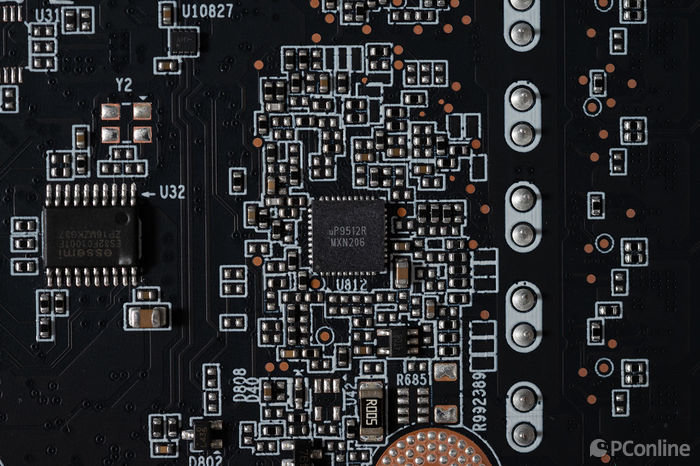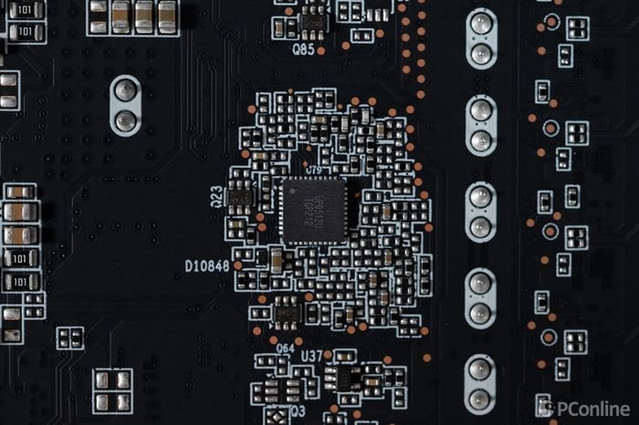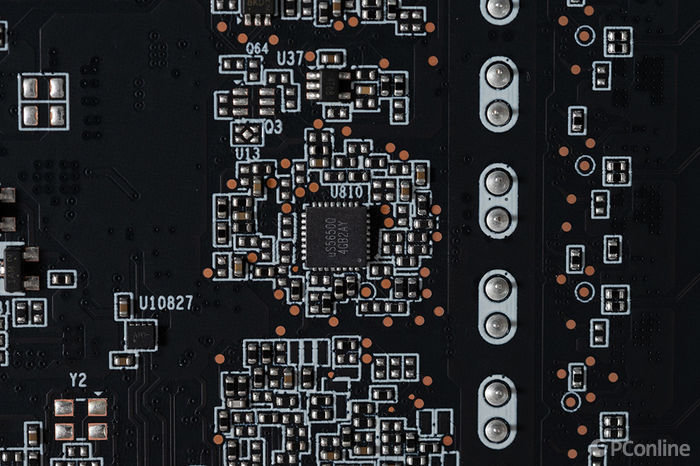 PWM主控则位于PCB的背部,型号分别是:uP9512R、uP9512U以及uS5650Q。其中uP9512R与uP9512U共同管理核心供电,可以做精细化的供电管理。