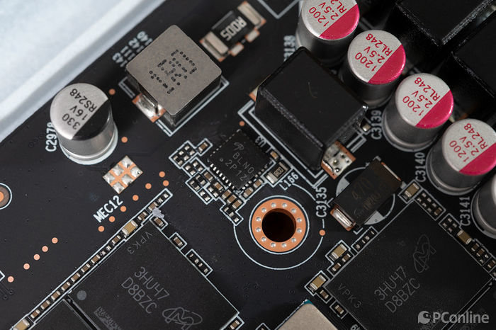 俯瞰整张PCB,你就可以发现,它的供电规模也堪称豪华,采用了SEP 2.0供电系统。供电总相数来到了夸张的28相,其中24相为核心供电,4相为显存供电,并且供电集成度相高,每相均采用了固态电容做输入输出,还有全封闭电感坐镇。
