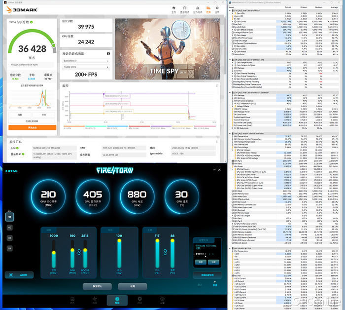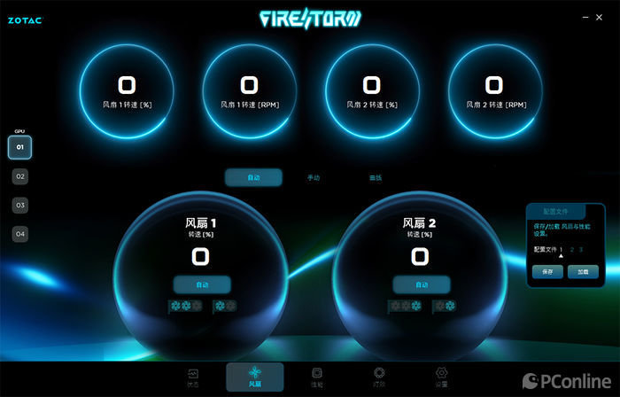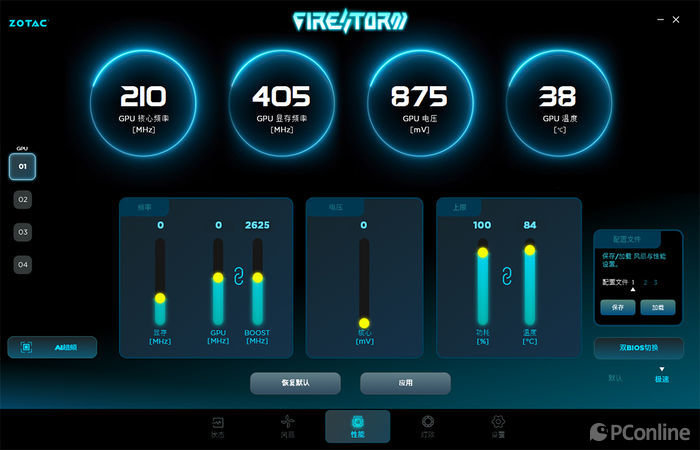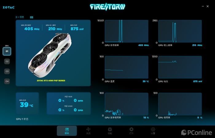 可以解锁功耗的RTX 4090,那怎么能少得了超频呢,索泰RTX 4090 PGF OC显卡,无论是散热配置还是性能释放,都是顶级中的顶级。这里我们将使用索泰的FireStorm控制中心对显卡进行超频,这款软件不仅能够用于超频,还能轻松控制显卡BIOS、灯效调节、查看显卡状态等。
