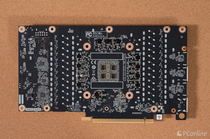 整张显卡的PCB板就突出“高级”二字,黑色的色调加上合理规整的设计,一眼就能看出它出自大厂之手。正面是各式各样的供电芯片、电感、核心以及显存,密密麻麻铺满了整个PCB板。