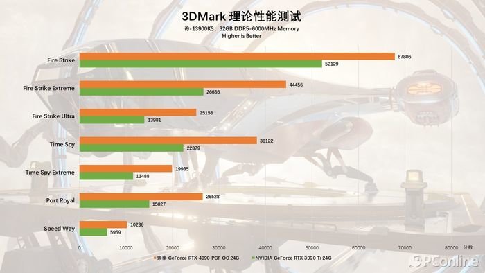 先看看索泰RTX 4090 PGF OC的基准性能吧,这里选用3DMark作为测试工具,从测试结果中可以看出,索泰RTX 4090 PGF OC对RTX 3090 Ti就是碾压,在DX 11为基准的Fire Strike系列测试中,67806的超高成绩比后者高出仅1W多分,性能提升幅度达到了近20%,而在DX 12为基准的Time Spy中,38122的超高分数同样强过RTX 3090 Ti的22379分。