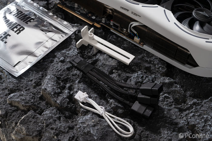 因此为了应对这个重量级的显卡,索泰也在包装盒内附赠了全金属的显卡支架,既美观又能杜绝显卡变形,给予显卡有效保护。少不了的还有电源转接线与RGB线,甚至连说明书都专门做了收纳,细节拉满。