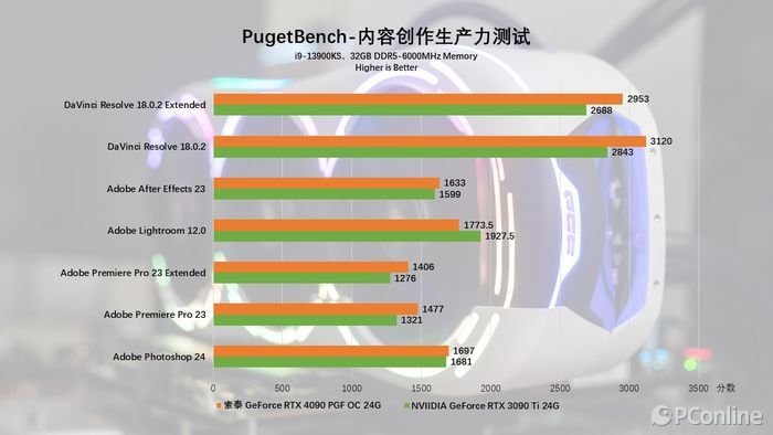 而在视频内容创作上,索泰RTX 4090 PGF OC得益于更快的显存于更强的性能,跑Pugetbench的Pr项目确实比前代卡皇快了很多,有大约30%的性能提升。如果你用达芬奇进行测试,那索泰RTX 4090 PGF OC的优势会更加明显,毕竟AV1编码是30系显卡不曾拥有的技术,后续我们也会对这部分进行更详细的测试。