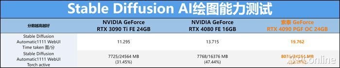 要说测AI又怎么能够少得了生成式AI中最经典的Stable Diffusion AI画图呢,拥有24GB超大显存的索泰RTX 4090 PGF OC显卡可以说是这里的最强王者!选择NVIDIA提供的描述,生成50张768 x 768的图片,索泰RTX 4090 PGF OC以1分钟19张图的速度一骑绝尘,作为对比,上代的RTX 3090 Ti则是一分钟11张图,可见架构革新确实能够带来不小的性能提升,换用新的RTX 40系显卡也能让你在AI时代乘风破浪。