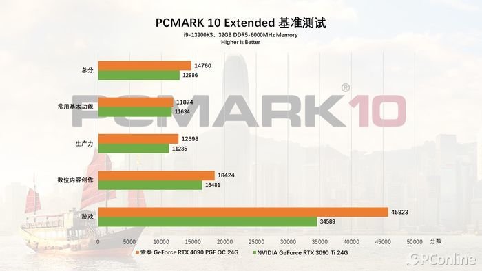 首先是PCMark 10 Extended项目,索泰RTX 4090 PGF OC显卡在每个项目上都完成了超越,整体性能领先前代的RTX 3090 Ti达到了15%左右,不过根据我们前面的测试,领先幅度远不止于此,毕竟单是游戏中就是几十上百帧的差距。