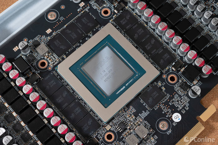 核心的周边则是12颗GDDR6X显存,来自美光科技,型号为2RU47 D8BZC,单颗显存容量2GB,12颗组成24GB超大显存。并且这几颗显存的速率可是满血的,显存速率为21Gbps。