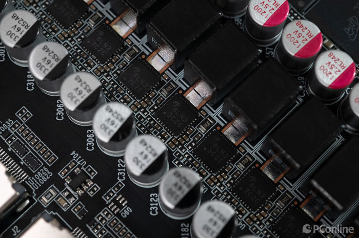 无论是核心供电还是显存供电,索泰均采用了统一规格的DrMos芯片,可见是下了血本了,芯片来自万国半导体,封装型号为BLN0与BLN3,实际应为AOS的AOZ5311NQI与AOZ5311NQI-03,二者持续输出电流均为55A。