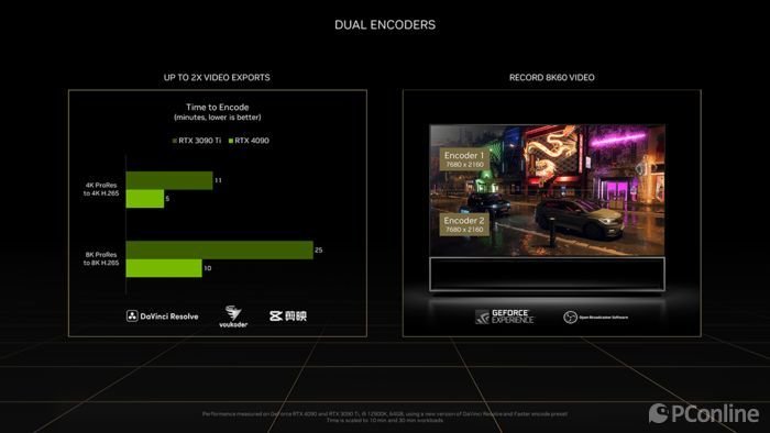 GeForce RTX 40 系列显卡还有一个全新的升级,那就是双编码器NVENC。第八代的NVENC双编码器不仅支持H.264与H.265,还支持开放式视频编码格式 AV1。