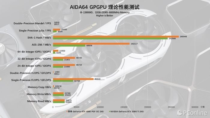 而在其他理论性能测试中,索泰RTX 4090 PGF OC更是王者风范,例如在GPGPU理论中,拥有Ada Lovalace架构的RTX 40系列显卡在算力上也有出色的性能表现,尤其是单精度和双精度浮点运算上,提升幅度是最大的。索泰RTX 4090 PGF OC整体性能相比RTX 3090 Ti的性能提升足足有92%左右,不少项目更是2倍甚至3倍的飞跃,着实让笔者越测越兴奋。
