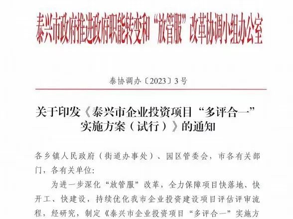 为进一步深化“放管服”改革,全力保障项目快落地、快开工、快建设,持续优化企业投资建设项目评估评审流程,日前,泰兴市出台《泰兴市企业投资项目“多评合一”实施方案(试行)》。