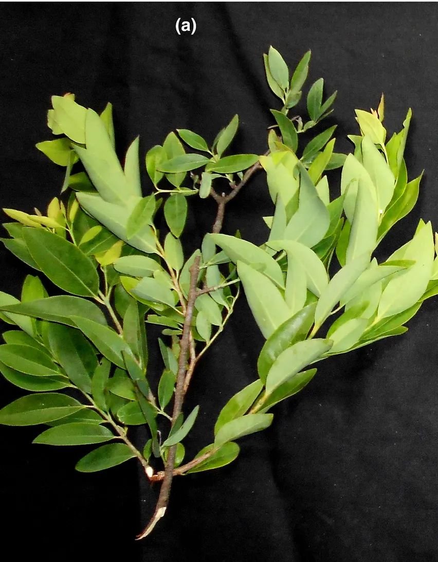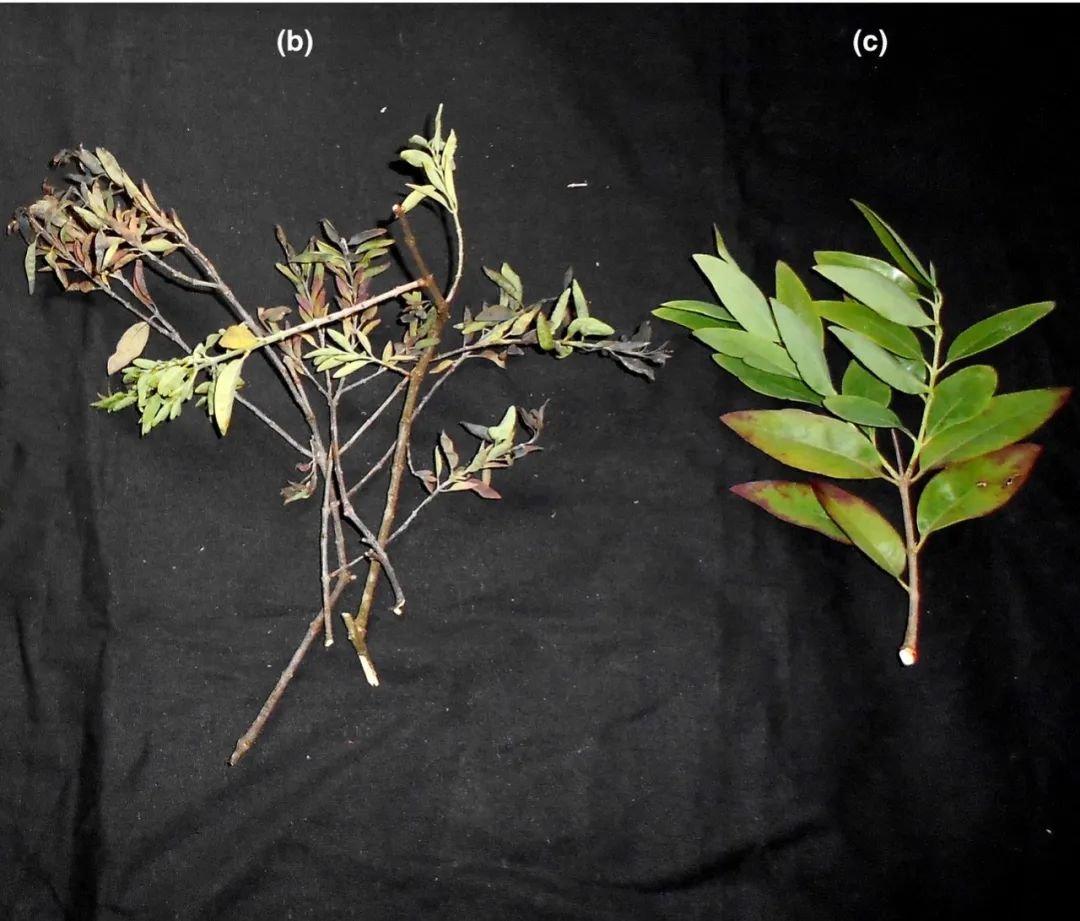健康檀香树(a)与穗状病檀香树(b晚期、c初期)对比