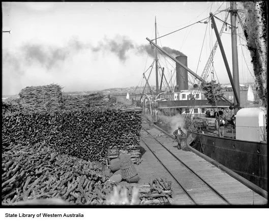 1920年代末西澳大利亚弗里曼港口上堆积的等待装载出口的檀香木