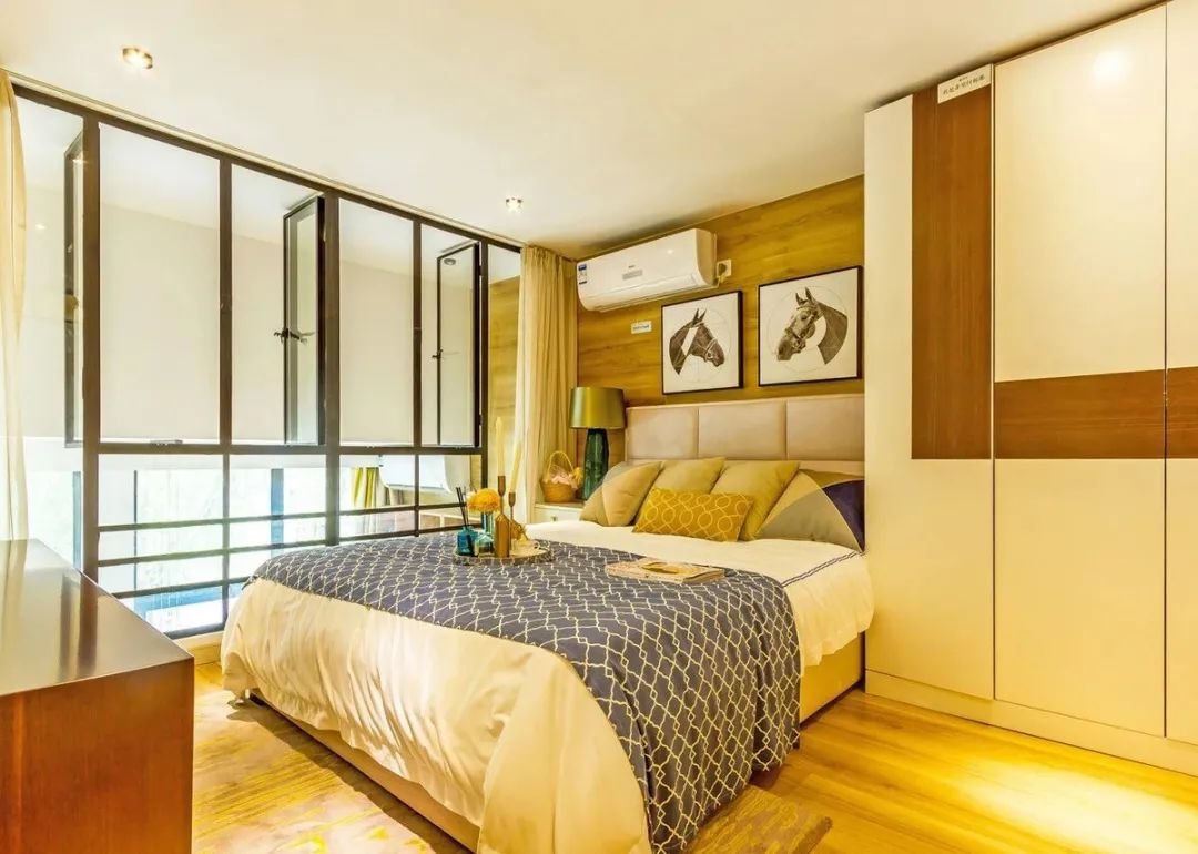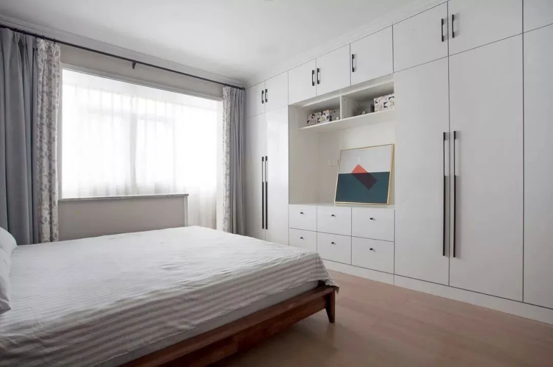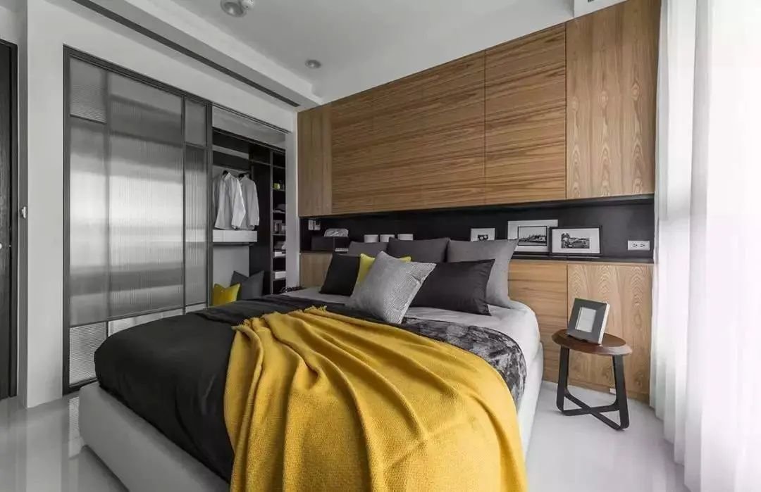 有些人在房间布置电视,所以出现电视墙背景+衣柜的一体式设计。两者的完美融合,合理利用空间,规划到位。