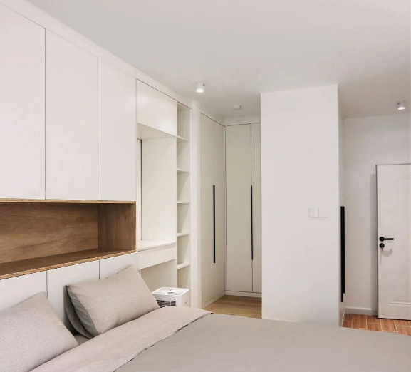 针对一些不是方正房间户型的设计,高效利用空间,避免浪费。转角衣柜很实用,将一些死角空间调整设计,可以很好的提升空间利用率和增加储物空间。