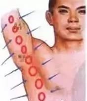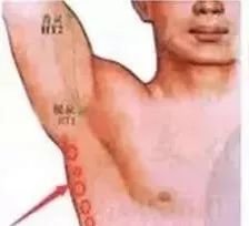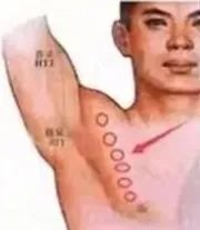 (4)压腋下极泉穴(有脉跳动处)40秒至1分钟,手有麻感热感松开,热流直冲手指,此法可治整个手臂病变,与曲池下1.5寸痛点合用,效果更佳。也可一手拇指压极泉(腋动脉)一手拇指压太渊,一压一放,对改善手臂血液循环疗效甚佳,拨极泉大筋时把极泉穴上面的手臂及腋下全部都拨拨,治病范围更广。