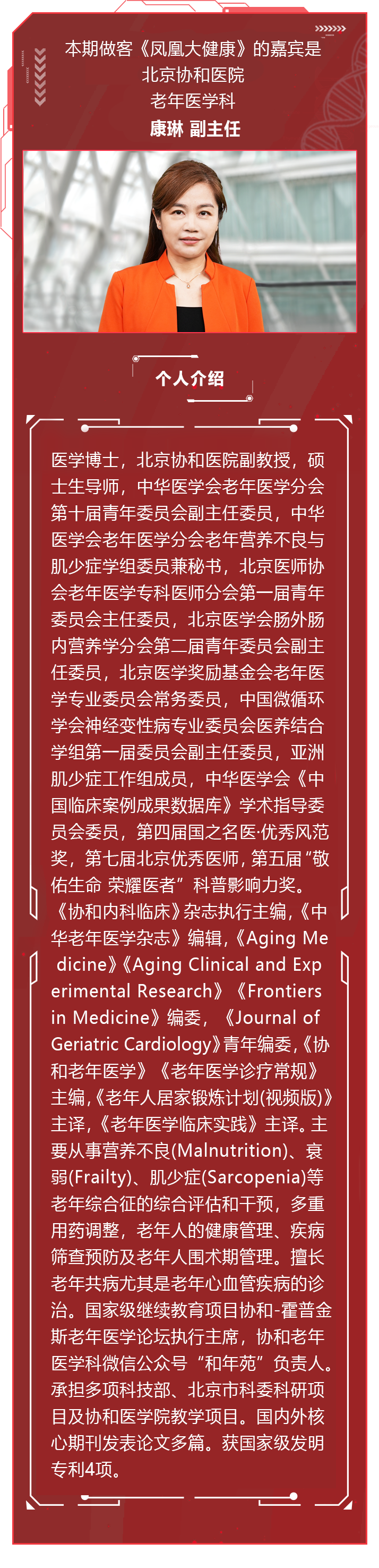 本期做客《凤凰大健康》的嘉宾是北京协和医院老年医学科副主任康琳,华佗五禽戏第59代传承人华一,陈氏太极拳第13代传承人李灵慧