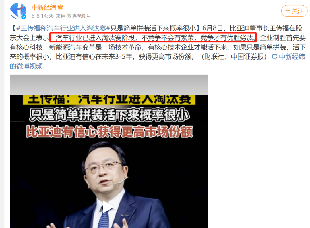 董事长王传福在会上说:与前几年新能车供不应求相比,今年很显然市场已经进入供大于求的时代,这个时期行业就会出现优胜劣汰,或者说叫淘汰赛,但这些都很正常,不竞争就不会有繁荣,没有压力就没有动力。