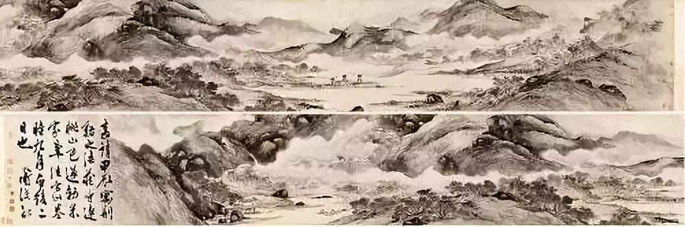 1544年,陈淳辞世。就在他生命中最后一年的夏末创作了《罨画山图》,这幅画气势磅礴,也是他最重要的山水画。在近5米的长卷上,陈淳用宋代米芾、米友仁父子开创的云山画法,以迅疾畅快的运笔,淋漓恣肆的水墨,将江南秋山之烟雨空蒙、变幻莫测的景象融化在笔端纸上,笔墨肯定,气势如虹,是毫无衰颓苍老之感的。