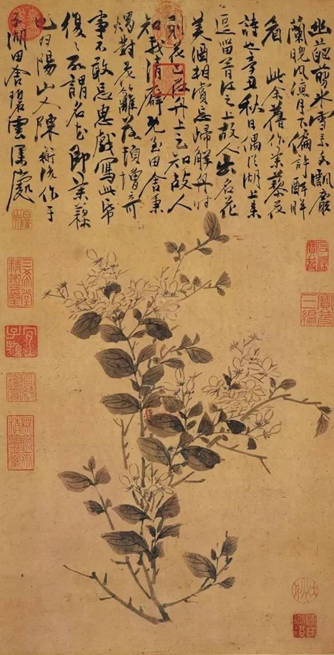 《茉莉》,用笔简率朴实,勾花点叶以书法入画,草草似不经意,却能得其生动自然的意趣。作于1541年,陈淳59岁。台北故宫博物院藏。