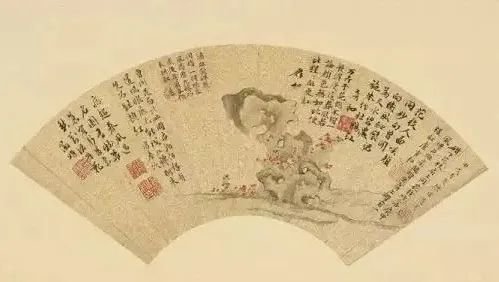 《湖石花卉扇面》是陈淳现存的最早的一件作品,作于1514年。那年他32岁,父亲尚在世。扇面上,中央画一块太湖石,缀以朱砂色小花,笔墨秀雅。自题:“甲戌首夏,陈淳道复。”甲戌,是明正德九年(1514)。扇上另有祝允明、唐寅、文征明、邢愿等人的题诗,可见陈淳年轻时的画作,得到了吴门画坛前辈画家们的一致好评。