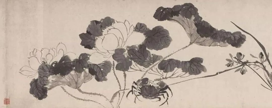 《墨蟹图》,江南水乡平凡的小景物,笔意简练,形态生动。稻穗稻叶,细笔淡墨,飘逸有致。作于1544年,陈淳最晚杰作。