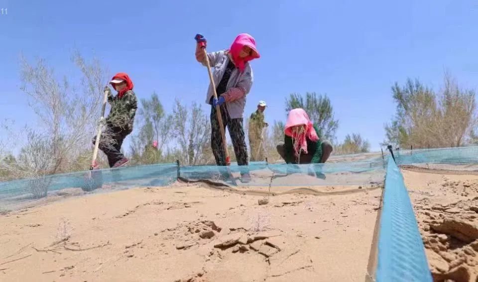 地处巴丹吉林沙漠南缘的临泽县一茬接着一茬固沙治沙,虽是六月的天气,但北部荒漠区仍然人头攒动,辛劳的治沙人埋沙障、补栽梭梭、浇水管护,“治沙播绿、防沙治沙”“接力赛”从未间断。