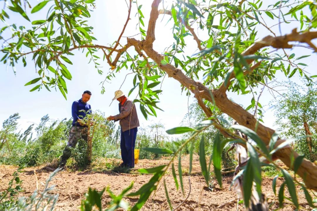 同时坚持谁治理、谁开发、谁受益的原则,推广拍卖、租赁、承包、转让、股份合作等治沙模式,让更多的群众、企业和社会组织参与到防沙治沙用沙中来,成为治沙的主力军,涌现出葱蓉林场、绿盈林场、明昌公司等社会资本治沙典型。“曾经的蓼泉南沙窝寸草不生,风吹沙起,像这六月的天气,人根本在太阳底下呆不了,晒得皮都疼。”绿盈林场场长王延福是一个热衷于治沙的个体实践者,在经历了早期沙窝里植树的艰辛和不易之后,他的7000亩梭梭、4500亩肉苁蓉、1800沙枣林终于“活下来”,成为蓼泉南沙窝的“绿带”,不仅改善了生态环境,也逐渐有了经济效益。“随着生态环境的转变,如今种树也容易成活了,要是在七八年前,像文冠果这类树在这儿根本栽不活。”王延福试种的文冠果今年大量挂果,鸡蛋大的绿果挂满树枝,满目惊喜。