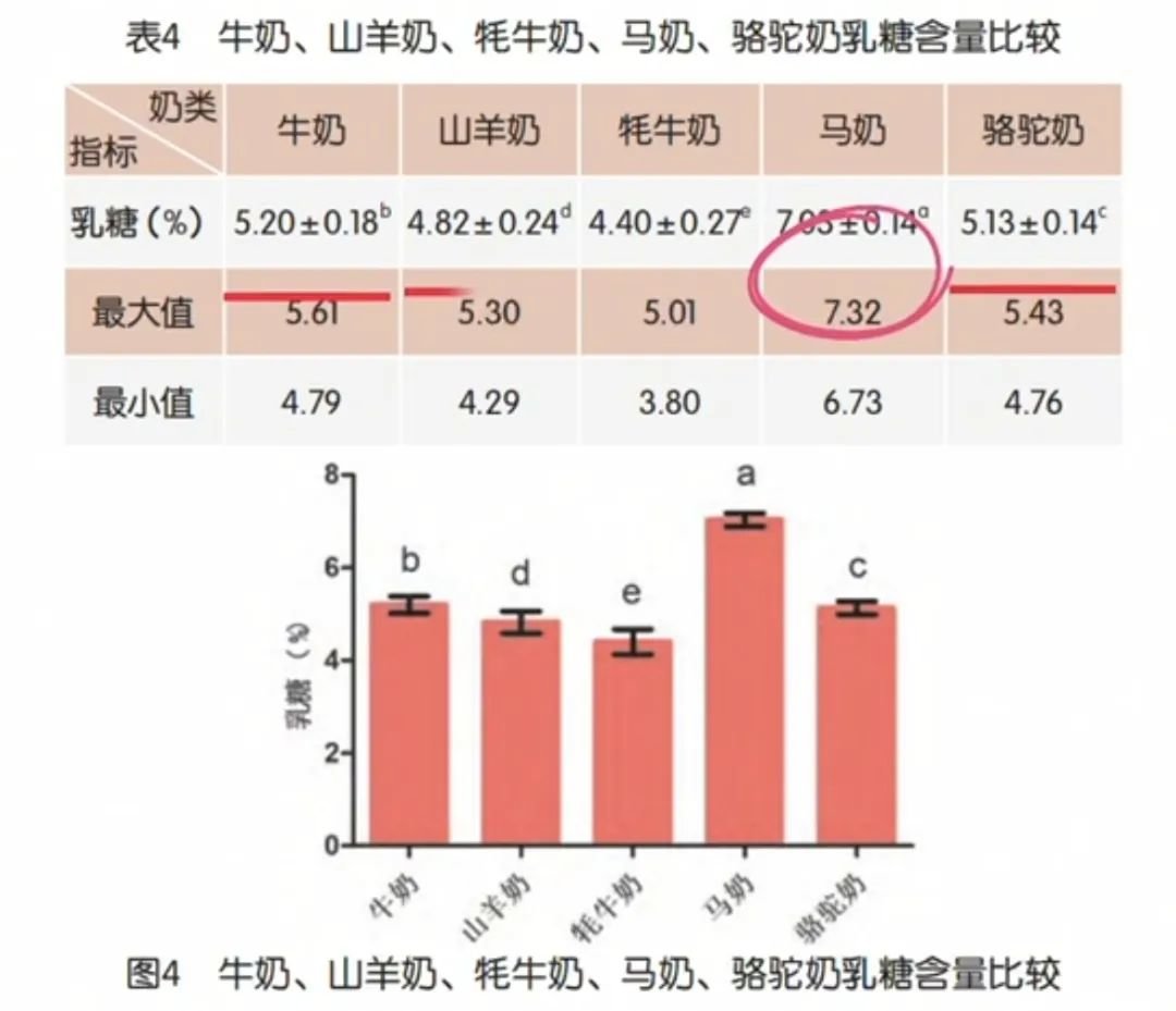 马奶的乳糖含量显著高于牛奶、骆驼奶和山羊奶,主要原因是马的肌肉较为发达,它的奔跑习性需要能量的快速合成。而乳糖经分解后会转化为能量,可以给马驹的生长提供能量。由于牛奶和羊奶市场化程度较高,商家大多选择直接将乳糖酶添加到奶品中来售卖。