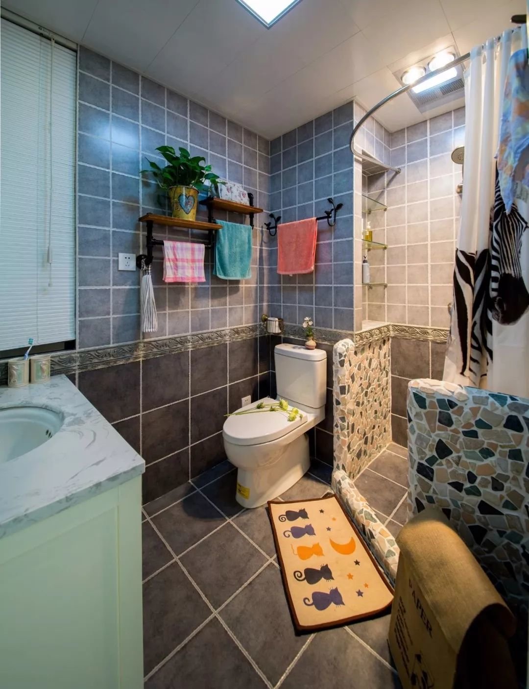 ▲卫生间淋浴房以砖砌矮墙,贴上碎砖+浴帘,显得极具文艺的异域设计感。