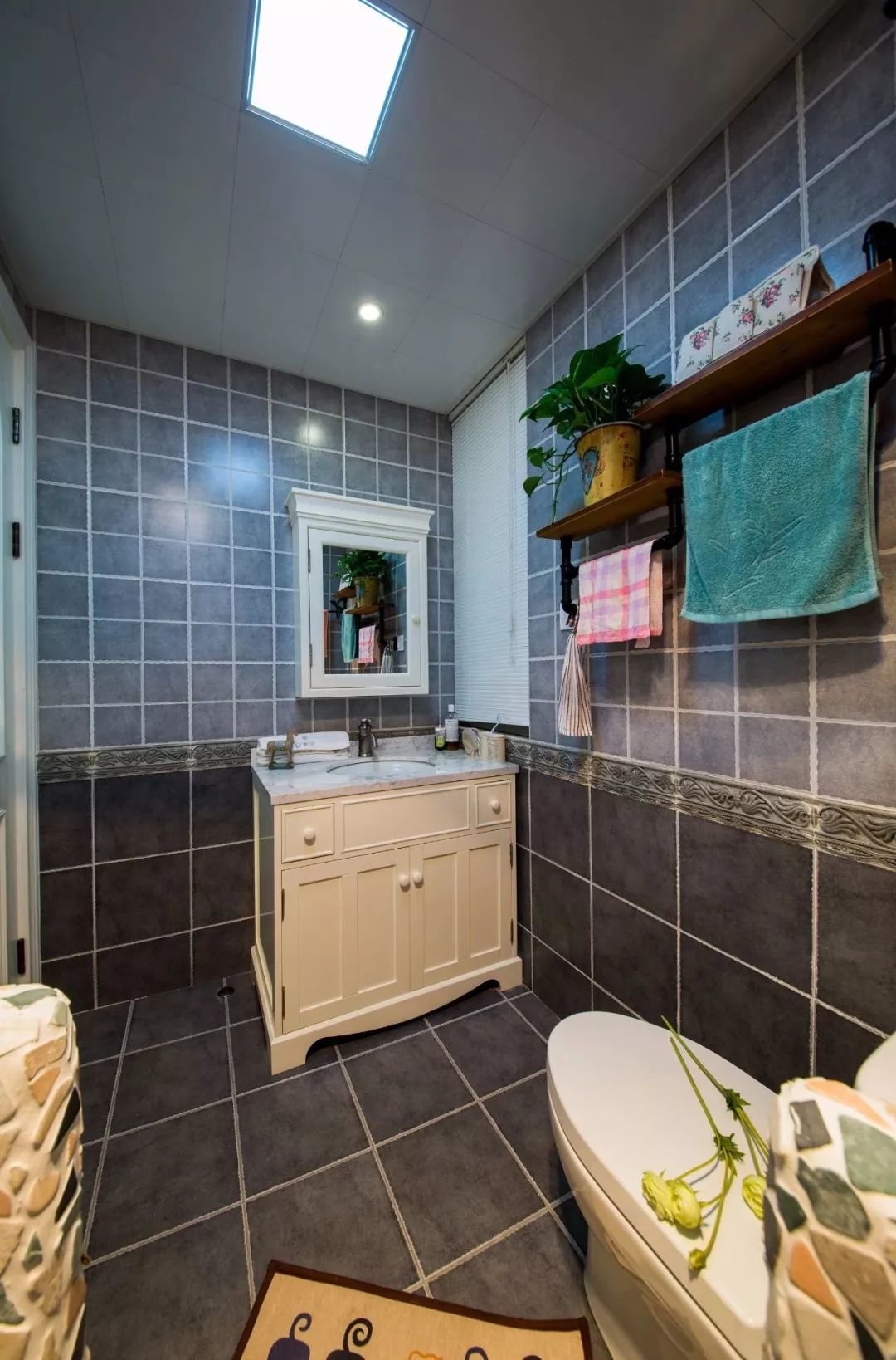 ▲角落安装成品洗手盆与镜柜,并装上带展示架的毛巾架,摆上绿植的装饰,让空间更加实用而清新文艺。
