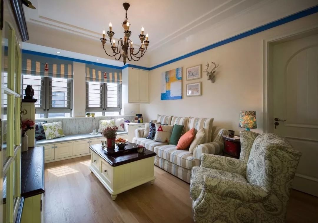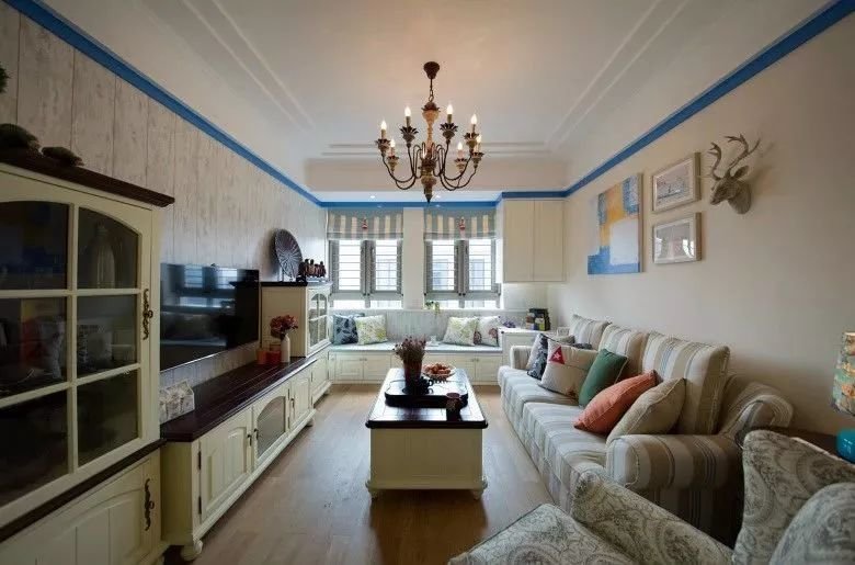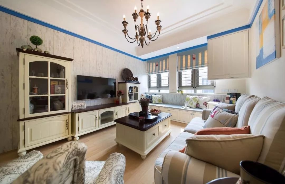 ▲客厅空间以暖色调为主的空间,墙面靠近天花做了一圈蓝色的装饰,布置上田园风的沙发、茶几与电视柜,结合做旧质感的电视墙墙布,让空间更加层次独特而又情趣。