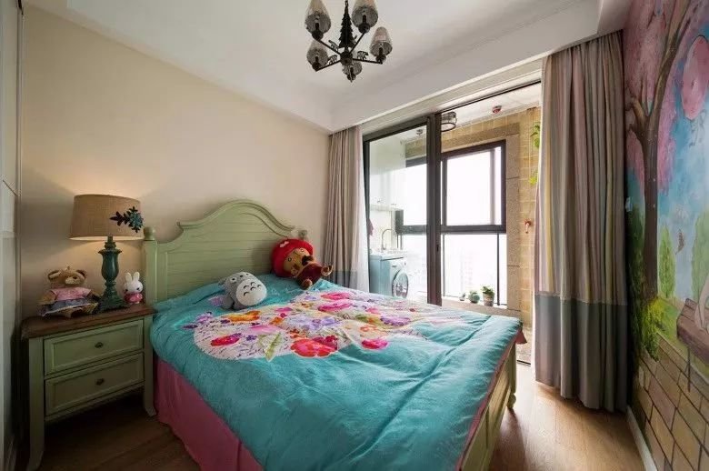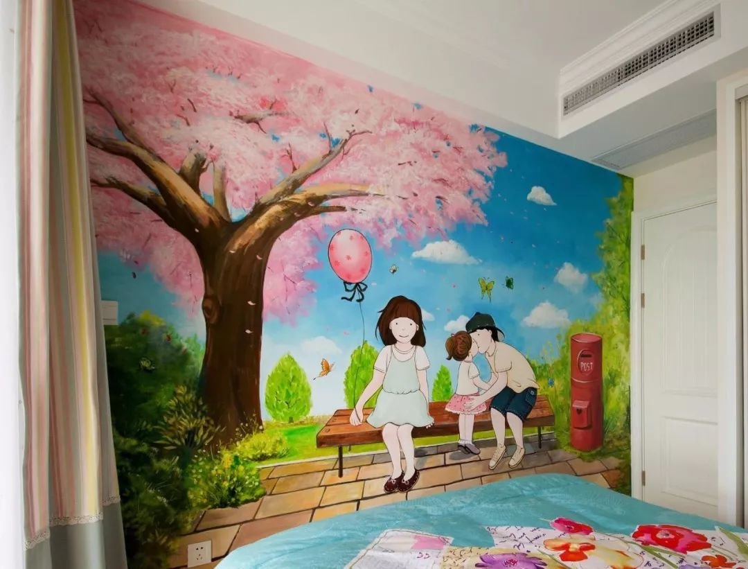 ▲床尾墙是手绘墙,整面墙都是卡通图案,粉色、绿色叙写一家人的温馨,让空间更加充满童趣浪漫的感受。
