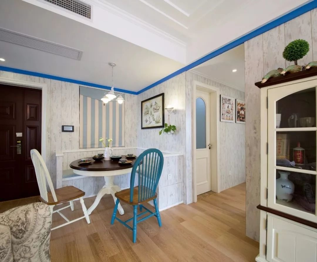 ▲餐厅靠墙卡座+圆餐桌,再搭配上蓝色与白色的温莎椅,加入蓝白条纹卷帘,森系图案装饰画,再以壁灯与吊灯的组合,让用餐空间充满清新文艺的浪漫格调。