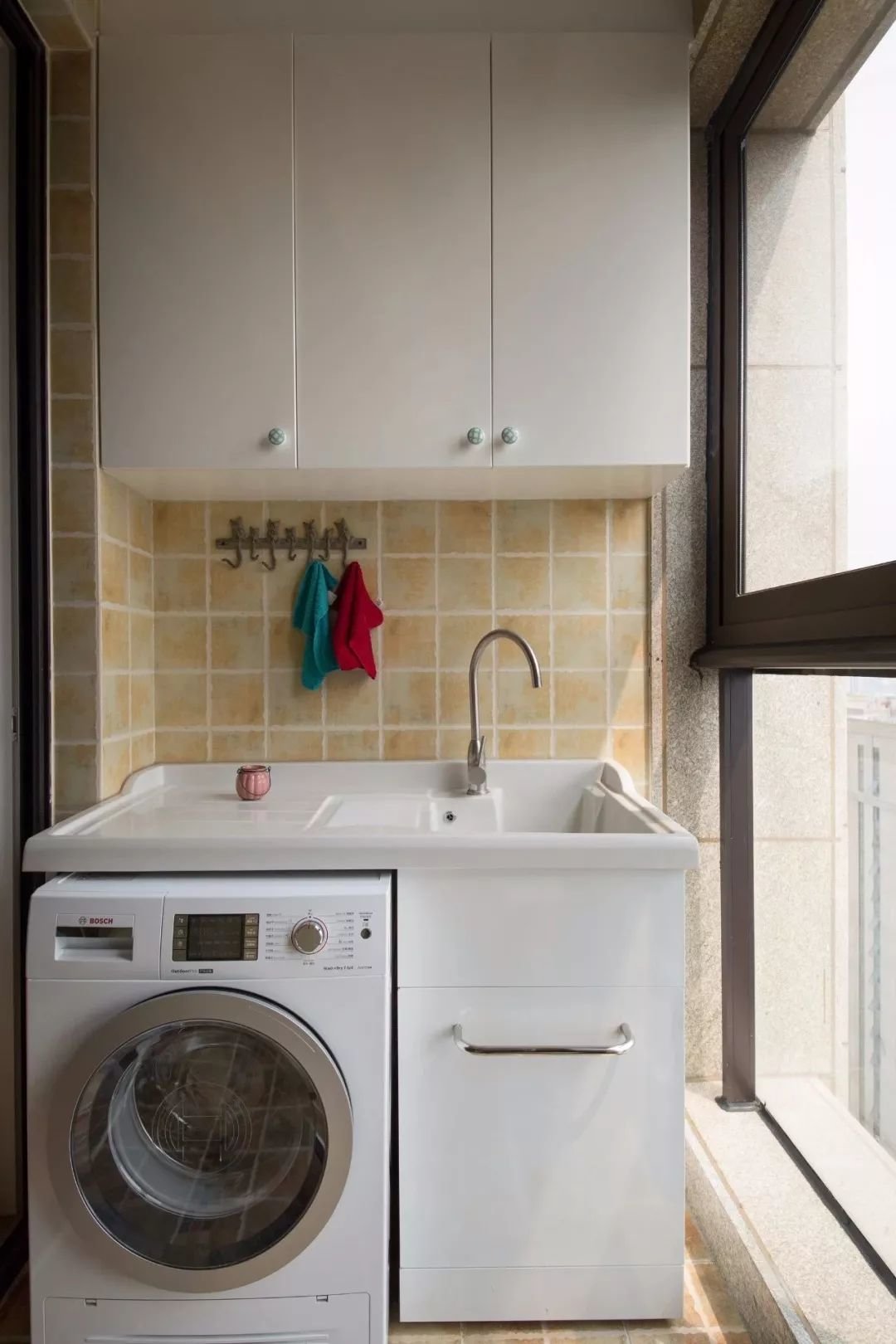 ▲阳台在浅棕色仿古砖的空间基础,以洗衣机柜+洗手盆组合的设计,上方装一个吊柜,打造了一个方便实用的洗衣与储物空间。